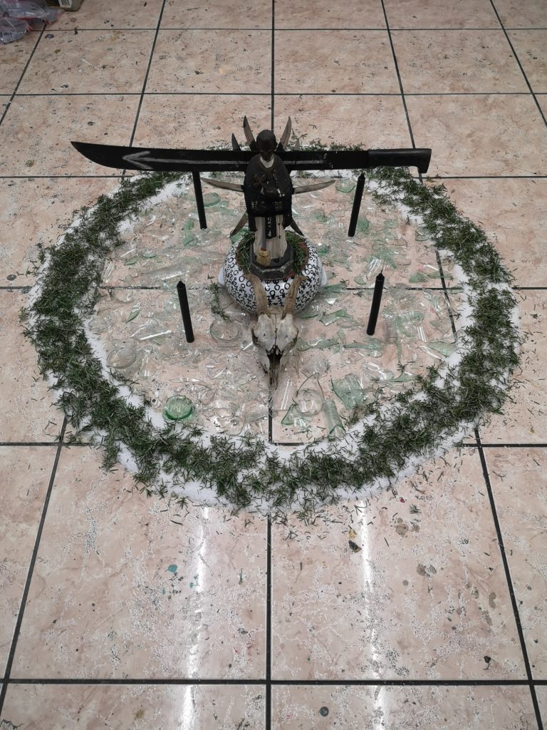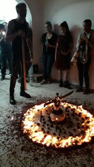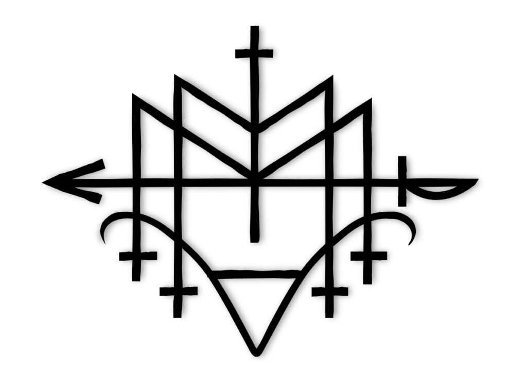 La irradiación de cuchillos alude a la potencia del doble etérico bien forjado a través de la disciplina y el trabajo de cultivo energético. El machete simboliza la disposición viril ante el terror que produce la exposición a las fuerzas astrales y el temple necesario para la contención  de experiencias cuya naturaleza es intransferible. La cama circular de vidrio molido y flores indica la dificultad de los logros verdaderos en la disciplina y el impacto que sobre el sistema nervioso producen tanto el terror como el gozo inexpresable del acceso al infinito, frente a los cuales la experiencia sexual física más gratificante solo es una tibia anécdota. El cráneo del cabrío  simboliza la capacidad de sobreponerse la muerte, el olvido y la disolución de la consciencia. Cuatro flamas cardinales son la guía a través del territorio de la noche negra pero estrellada.